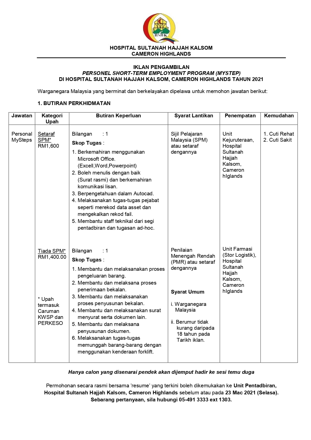 Jawatan Kosong Hospital Sultanah Hajjah Kalsom