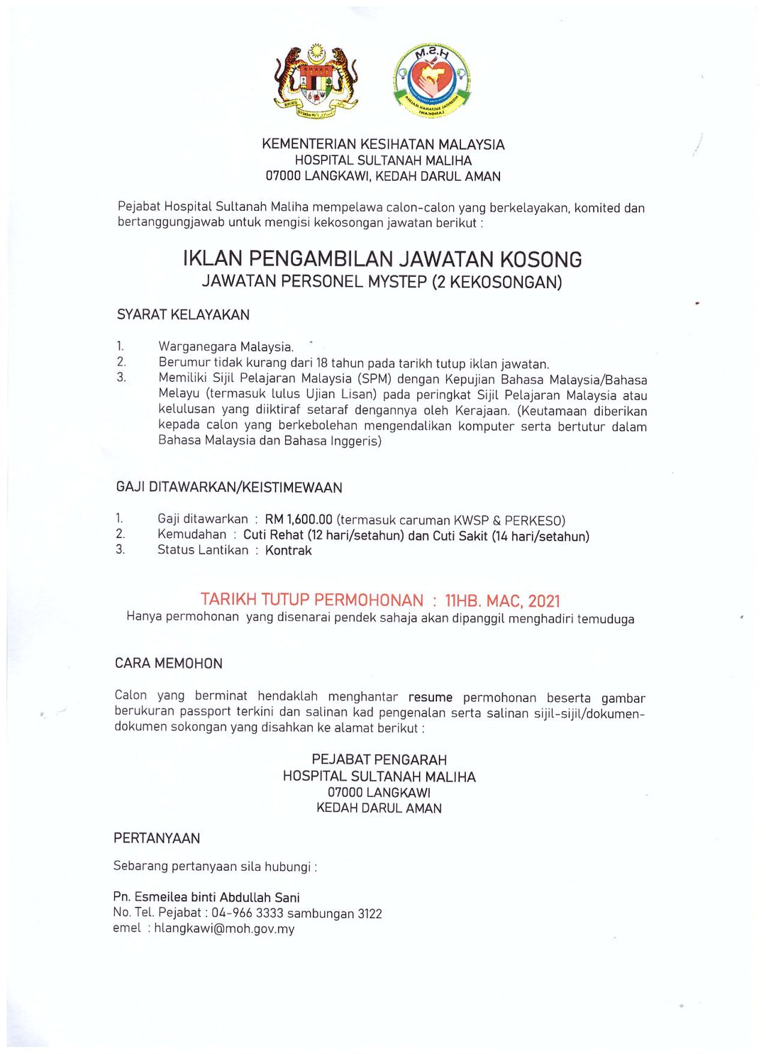 Jawatan Kosong Hospital Sultanah Maliha