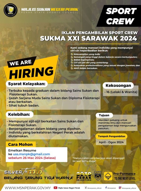 Ikaln Jawatan Majlis Sukan Negeri Perak Like serta Ikut Facebook Kami, follow Chanel WhatsApp Jawatan Kosong & Telegram Portal SPA9 untuk capaian pantas kekosongan jawatan daripada kami sekarang.