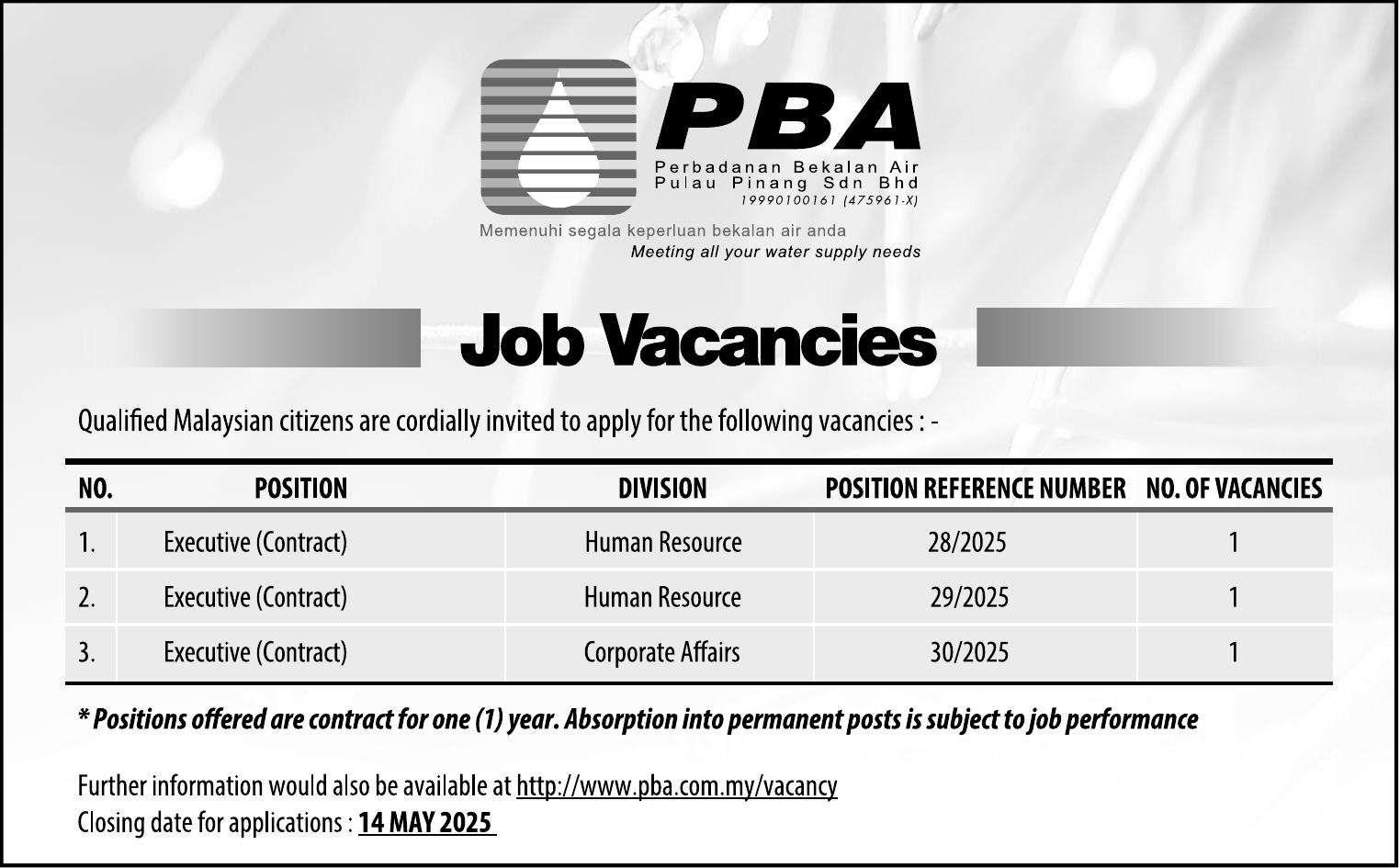 Iklan Kini Jawatan Kosong Perbadanan Bekalan Air Pulau Pinang Sdn Bhd PBA_NST_8x4_300425 Like serta Ikut Facebook Kami, follow Chanel WhatsApp Jawatan Kosong & Telegram Portal SPA9 untuk capaian pantas kekosongan jawatan daripada kami sekarang.