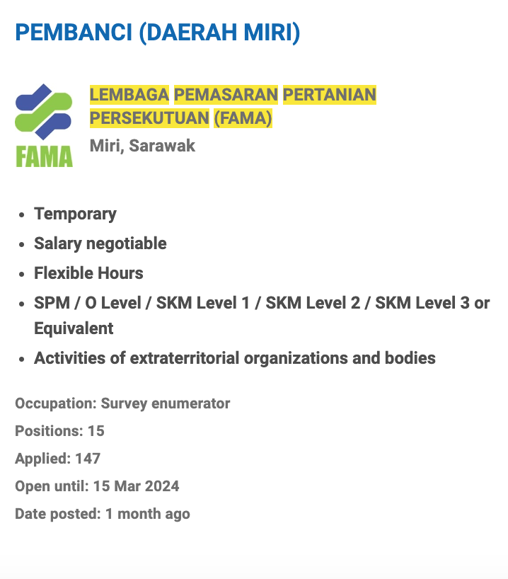 Permohonan jawatan ini boleh dibuat melalui Portal MyFutureJobs. Sila ke Portal MyFutureJobs dan Masukkan Kata Carian yang ingin dicari “LEMBAGA PEMASARAN PERTANIAN PERSEKUTUAN (FAMA)” di bahagian carian untuk memohon jawatan yang diiklankan.