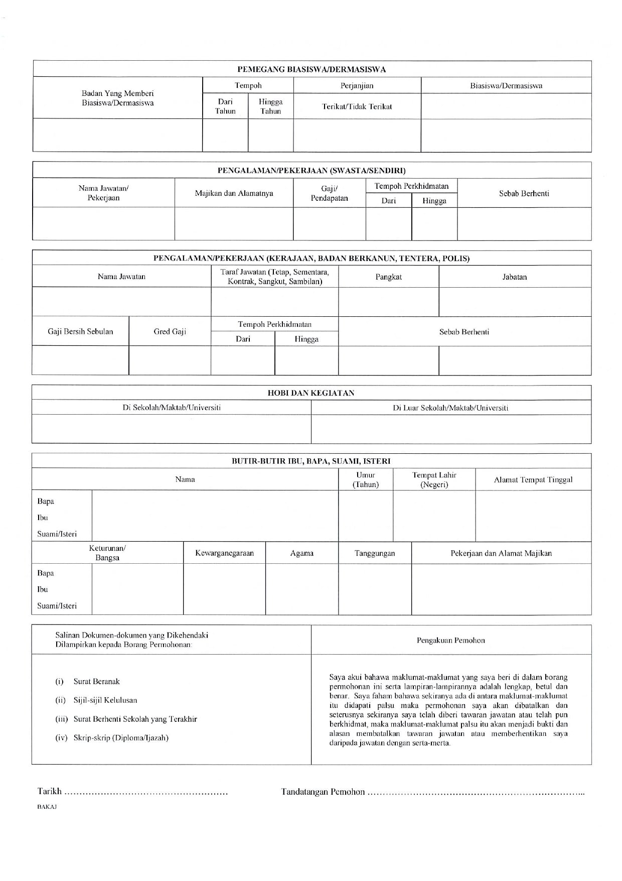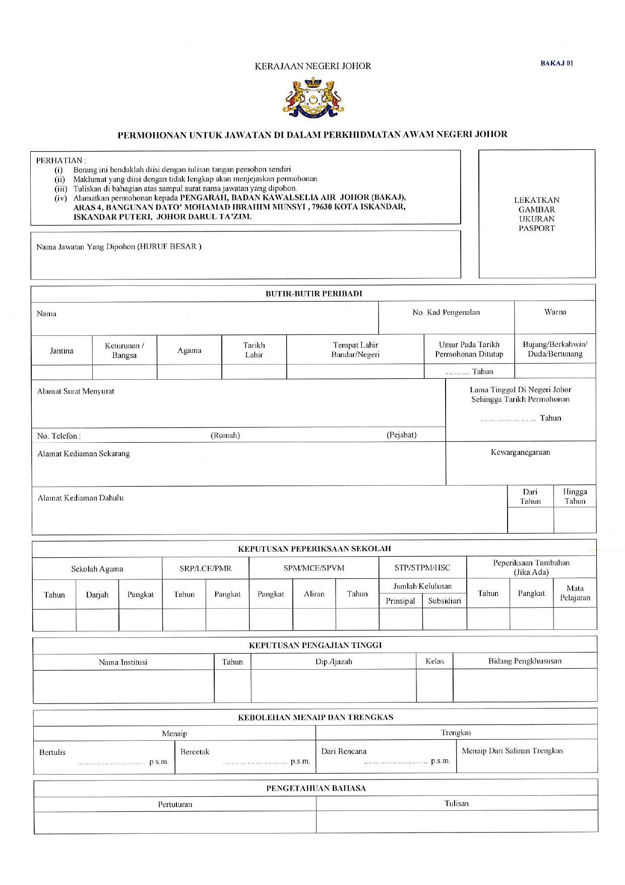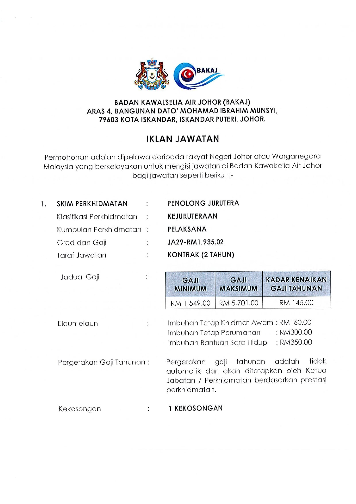 Iklan Jawatan Pejabat Badan Kawalselia Air Johor (BAKAJ) IKLAN JAWATAN Like serta Ikut Facebook Kami, follow Chanel WhatsApp Jawatan Kosong & Telegram Portal SPA9 untuk capaian pantas kekosongan jawatan daripada kami sekarang. BORANG PERMOHONAN
