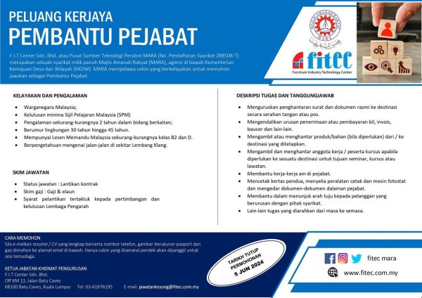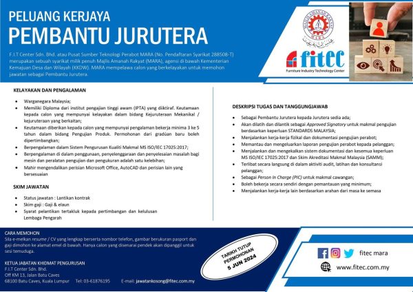 Iklan Furniture Industry Technology Center (FITEC) MARA Like serta Ikut Facebook Kami, follow Chanel WhatsApp Jawatan Kosong & Telegram Portal SPA9 untuk capaian pantas kekosongan jawatan daripada kami sekarang.