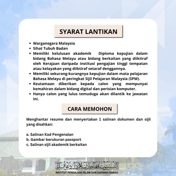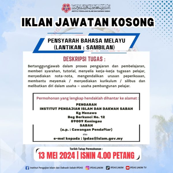 Iklan Institut Pengajian Islam Dan Dakwah Sabah – IPDAS Like serta Ikut Facebook Kami, follow Chanel WhatsApp Jawatan Kosong & Telegram Portal SPA9 untuk capaian pantas kekosongan jawatan daripada kami sekarang.