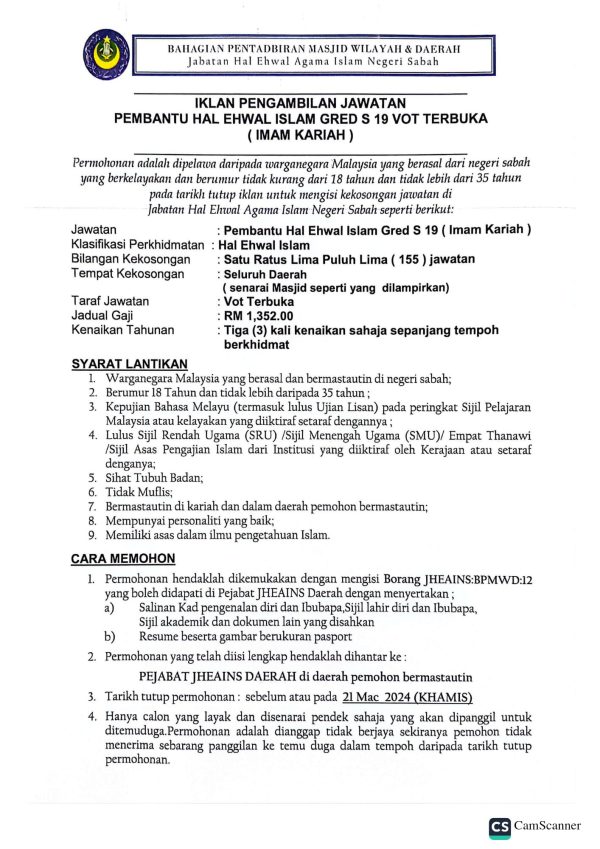 Iklan Jabatan Hal Ehwal Agama Islam Negeri Sabah Like serta Ikut Facebook Kami, follow Chanel WhatsApp Jawatan Kosong & Telegram Portal SPA9 untuk capaian pantas kekosongan jawatan daripada kami sekarang.