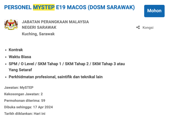 Permohonan jawatan ini boleh dibuat melalui Portal MyFutureJobs. Sila ke Portal MyFutureJobs dan Masukkan Kata Carian yang ingin dicari “JABATAN PERANGKAAN MALAYSIA NEGERI SARAWAK” di bahagian carian untuk memohon jawatan yang diiklankan.