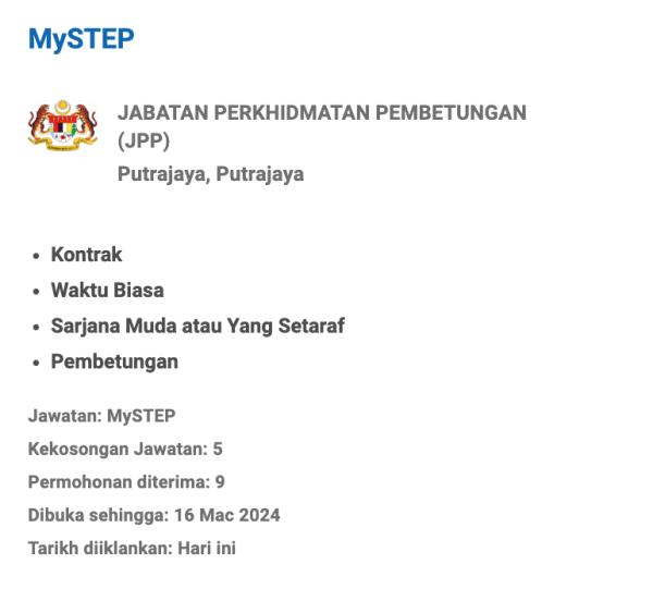 Permohonan jawatan ini boleh dibuat melalui Portal MyFutureJobs. Sila ke Portal MyFutureJobs dan Masukkan Kata Carian yang ingin dicari “PERKHIDMATAN PEMBETUNGAN (JPP)” di bahagian carian untuk memohon jawatan yang diiklankan.