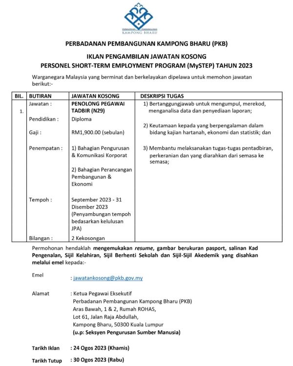 Iklan Jawaatn Perbadanan Pembangunan Kampong Bharu Like serta Ikut Facebook Kami, follow Chanel WhatsApp Jawatan Kosong & Telegram Portal SPA9 untuk capaian pantas kekosongan jawatan daripada kami sekarang.