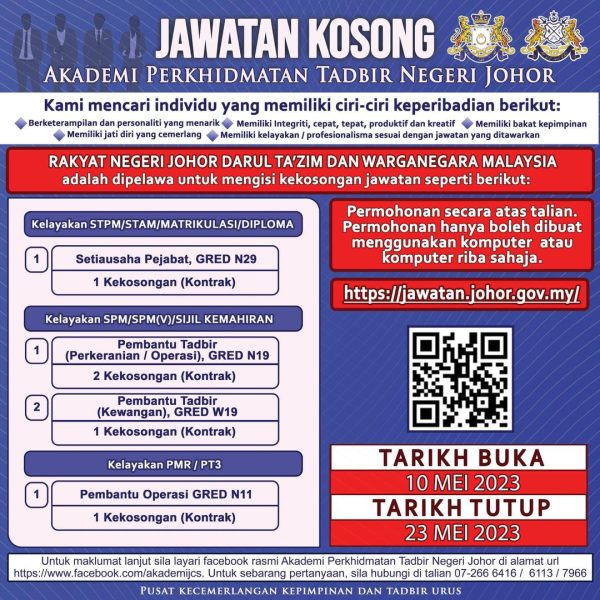 Iklan Jawatan Akademi Perkhidmatan Tadbir Negeri Johor Like serta Ikut Facebook Kami, follow Chanel WhatsApp Jawatan Kosong & Telegram Portal SPA9 untuk capaian pantas kekosongan jawatan daripada kami sekarang. Klik Jawatan Disini