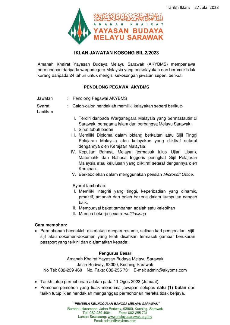 Iklan Jawatan Amanah Khairat Yayasan Budaya Melayu Sarawak Like serta Ikut Facebook Kami, follow Chanel WhatsApp Jawatan Kosong & Telegram Portal SPA9 untuk capaian pantas kekosongan jawatan daripada kami sekarang.