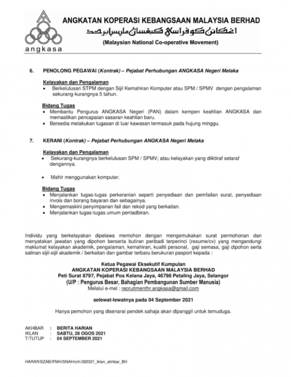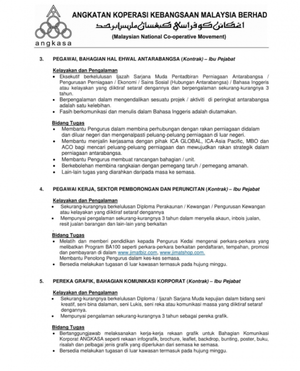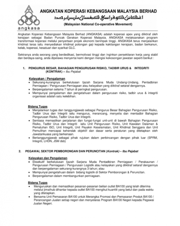 Iklan Jawatan Angkasa Koperasi Kebangsaan Malaysia Berhad Like serta Ikut Facebook Kami, follow Chanel WhatsApp Jawatan Kosong & Telegram Portal SPA9 untuk capaian pantas kekosongan jawatan daripada kami sekarang.