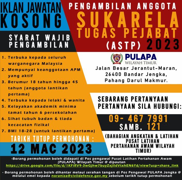 Iklan Jawatan Angkatan Pertahanan Awam Seluruh Malaysia Like serta Ikut Facebook Kami, follow Chanel WhatsApp Jawatan Kosong & Telegram Portal SPA9 untuk capaian pantas kekosongan jawatan daripada kami sekarang.