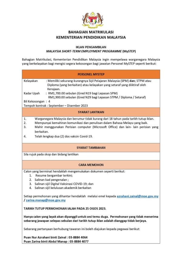 Iklan Jawatan Bahagian Matrikulasi, Kementerian Pendidikan Malaysia Like serta Ikut Facebook Kami, follow Chanel WhatsApp Jawatan Kosong & Telegram Portal SPA9 untuk capaian pantas kekosongan jawatan daripada kami sekarang.