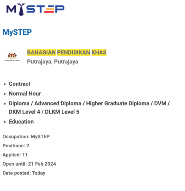 Permohonan jawatan ini boleh dibuat melalui Portal MyFutureJobs. Sila ke Portal MyFutureJobs dan Masukkan Kata Carian yang ingin dicari “BAHAGIAN PENDIDIKAN KHAS” di bahagian carian untuk memohon jawatan yang diiklankan.