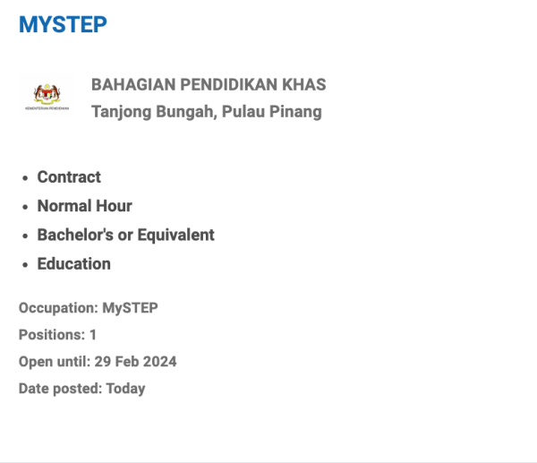 Permohonan jawatan ini boleh dibuat melalui Portal MyFutureJobs. Sila ke Portal MyFutureJobs dan Masukkan Kata Carian yang ingin dicari “BAHAGIAN PENDIDIKAN KHAS” di bahagian carian untuk memohon jawatan yang diiklankan.