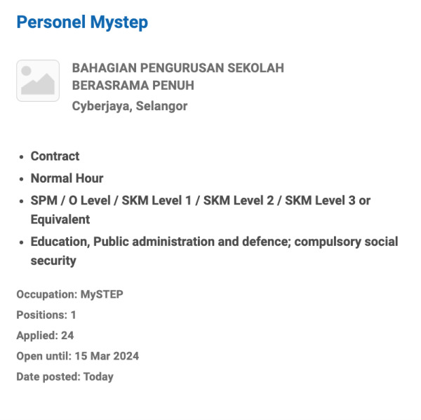 Permohonan jawatan ini boleh dibuat melalui Portal MyFutureJobs. Sila ke Portal MyFutureJobs dan Masukkan Kata Carian yang ingin dicari “BAHAGIAN PENGURUSAN SEKOLAH BERASRAMA PENUH” di bahagian carian untuk memohon jawatan yang diiklankan.