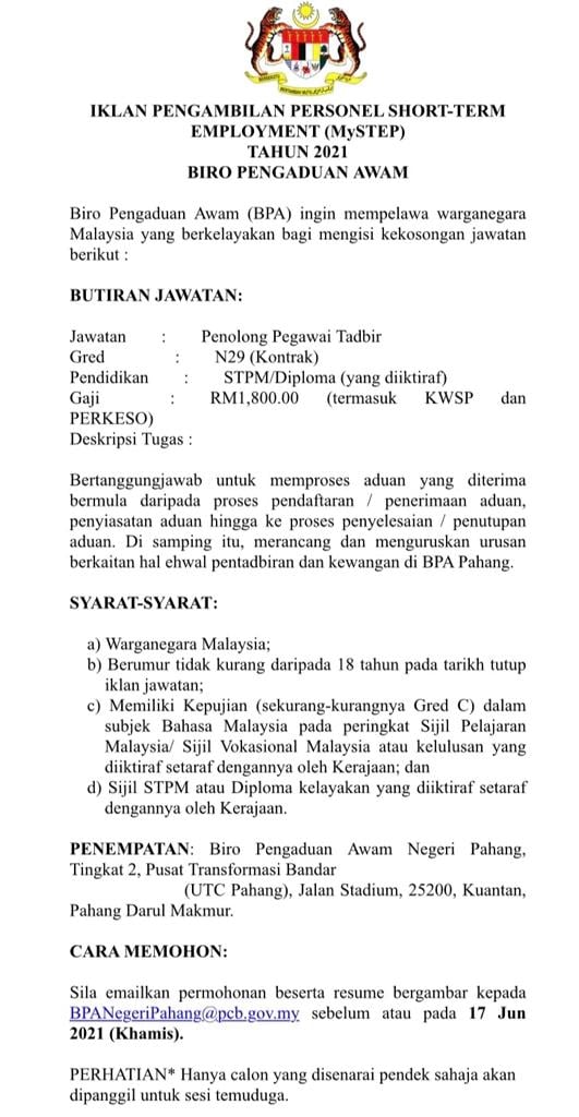 Iklan Jawatan Biro Pengaduan Awam (BPA) Like serta Ikut Facebook Kami, follow Chanel WhatsApp Jawatan Kosong & Telegram Portal SPA9 untuk capaian pantas kekosongan jawatan daripada kami sekarang.