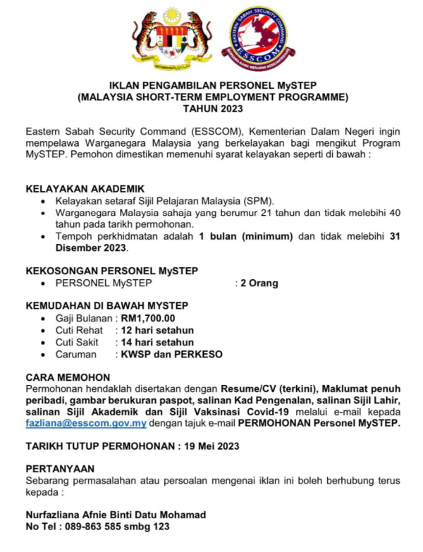 Iklan Jawatan Eastern Sabah Security Command (ESSCOM) Like serta Ikut Facebook Kami, follow Chanel WhatsApp Jawatan Kosong & Telegram Portal SPA9 untuk capaian pantas kekosongan jawatan daripada kami sekarang.