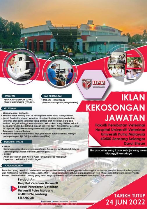 Iklan Jawatan Fakulti Perubatan Veterinar Universiti Putra Malaysia (UPM) Like serta Ikut Facebook Kami, follow Chanel WhatsApp Jawatan Kosong & Telegram Portal SPA9 untuk capaian pantas kekosongan jawatan daripada kami sekarang. BORANG PERMOHONAN