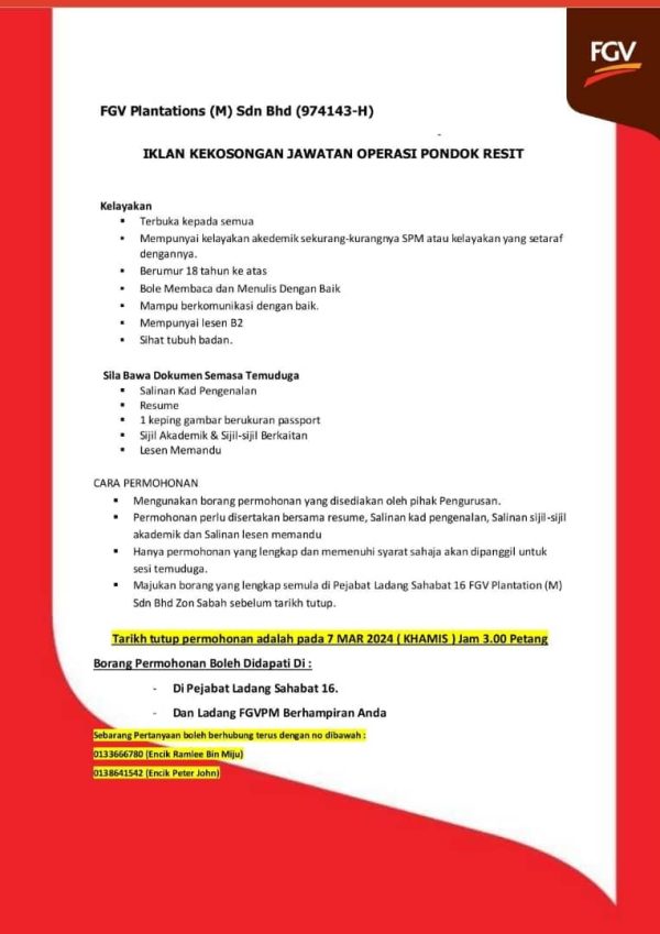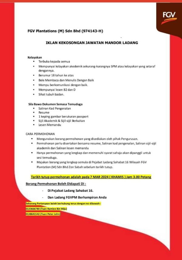 Iklan Jawatan FGV Plantations Like serta Ikut Facebook Kami, follow Chanel WhatsApp Jawatan Kosong & Telegram Portal SPA9 untuk capaian pantas kekosongan jawatan daripada kami sekarang.