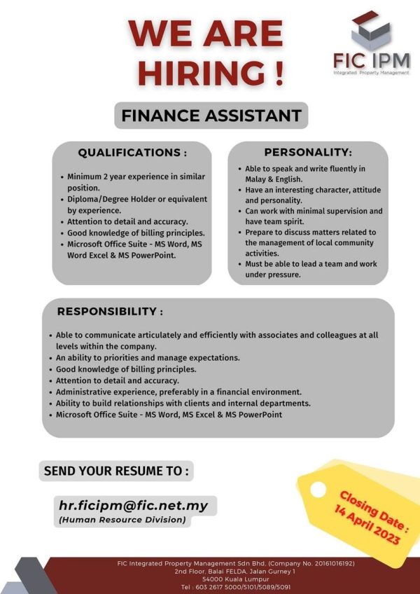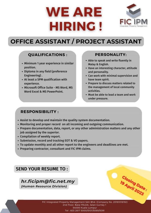 Iklan Jawatan FIC Integrated Property Management Sdn Bhd Like serta Ikut Facebook Kami, follow Chanel WhatsApp Jawatan Kosong & Telegram Portal SPA9 untuk capaian pantas kekosongan jawatan daripada kami sekarang.