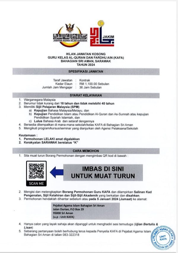 Iklan Jawatan Guru KAFA Jawatan Kosong Jabatan Agama Islam Sarawak Like serta Ikut Facebook Kami, follow Chanel WhatsApp Jawatan Kosong & Telegram Portal SPA9 untuk capaian pantas kekosongan jawatan daripada kami sekarang.