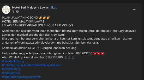 Iklan Jawatan Hotel Seri Malaysia Lawas Like serta Ikut Facebook Kami, follow Chanel WhatsApp Jawatan Kosong & Telegram Portal SPA9 untuk capaian pantas kekosongan jawatan daripada kami sekarang.
