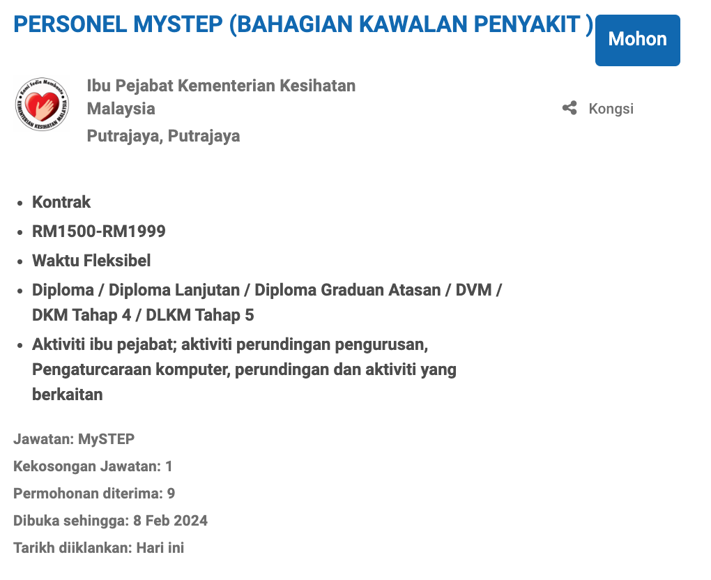 Iklan Jawatan Ibu Pejabat Kementerian Kesihatan Malaysia