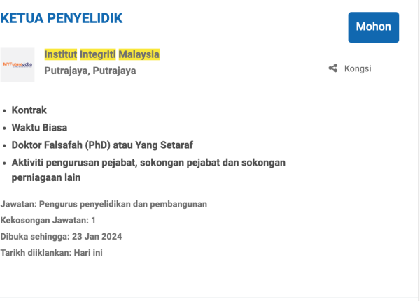 Iklan Jawatan Institut Integriti Malaysia Like serta Ikut Facebook Kami, follow Chanel WhatsApp Jawatan Kosong & Telegram Portal SPA9 untuk capaian pantas kekosongan jawatan daripada kami sekarang.