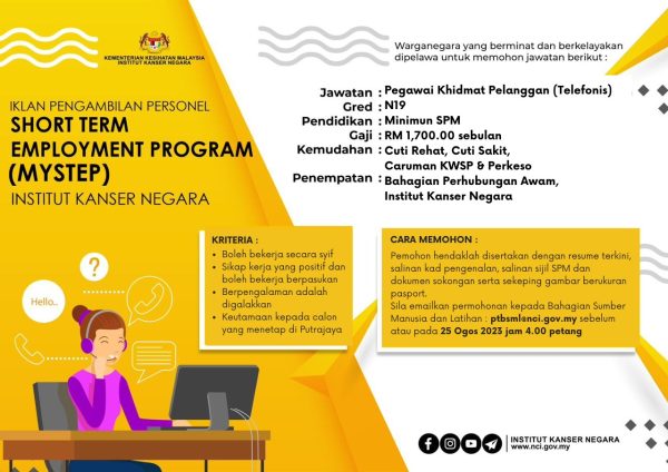 Iklan Jawatan Institut Kanser Negara Like serta Ikut Facebook Kami, follow Chanel WhatsApp Jawatan Kosong & Telegram Portal SPA9 untuk capaian pantas kekosongan jawatan daripada kami sekarang.