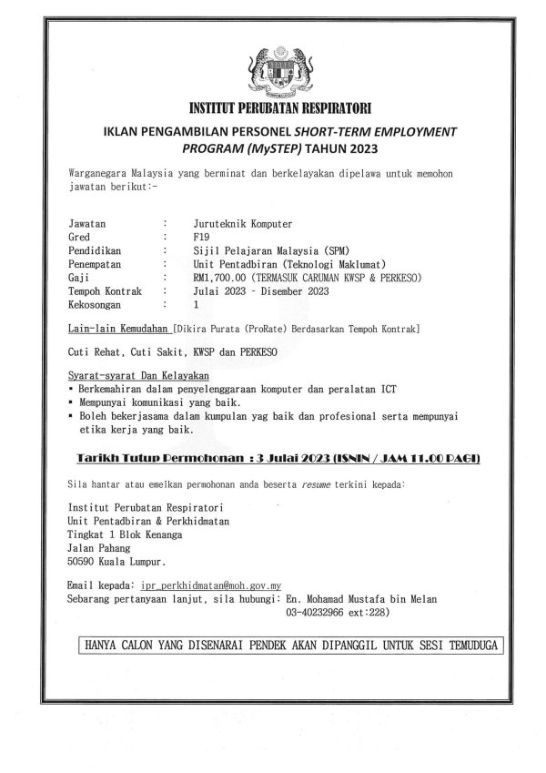 Iklan Jawatan Institut Perubatan Respiratori Like serta Ikut Facebook Kami, follow Chanel WhatsApp Jawatan Kosong & Telegram Portal SPA9 untuk capaian pantas kekosongan jawatan daripada kami sekarang.