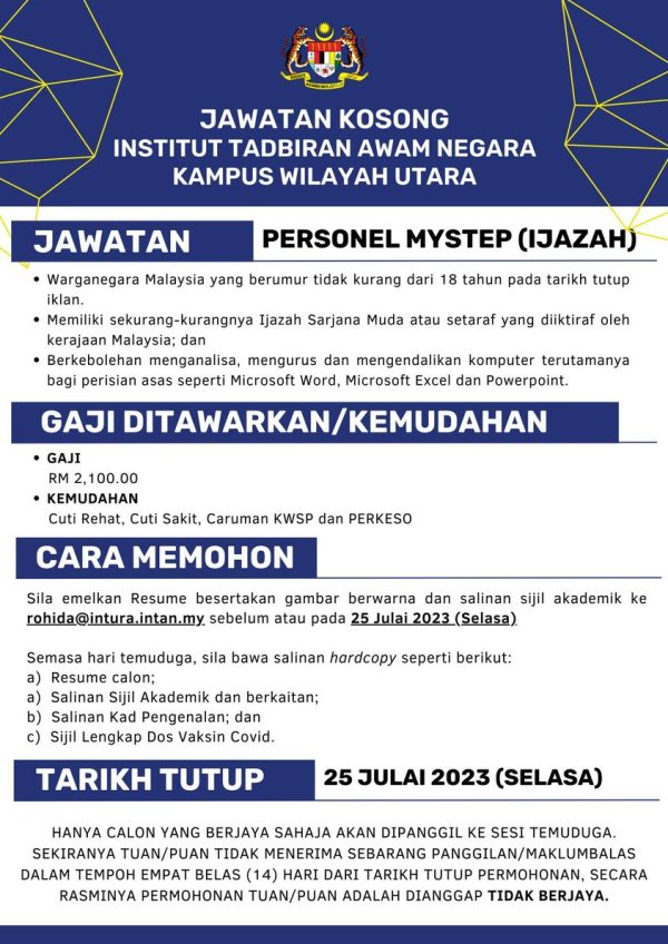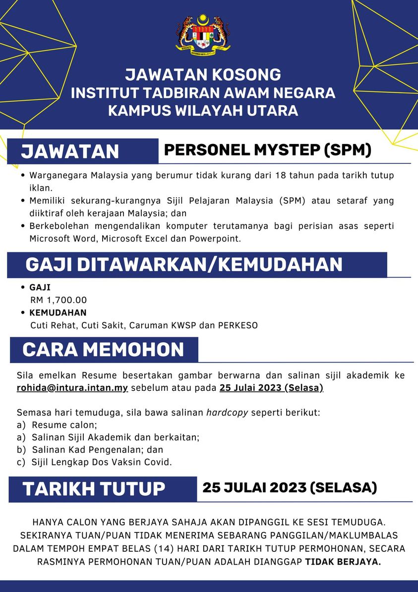 IKlan Jawatan Institut Tadbiran Awam Negara (INTAN) Like serta Ikut Facebook Kami, follow Chanel WhatsApp Jawatan Kosong & Telegram Portal SPA9 untuk capaian pantas kekosongan jawatan daripada kami sekarang.