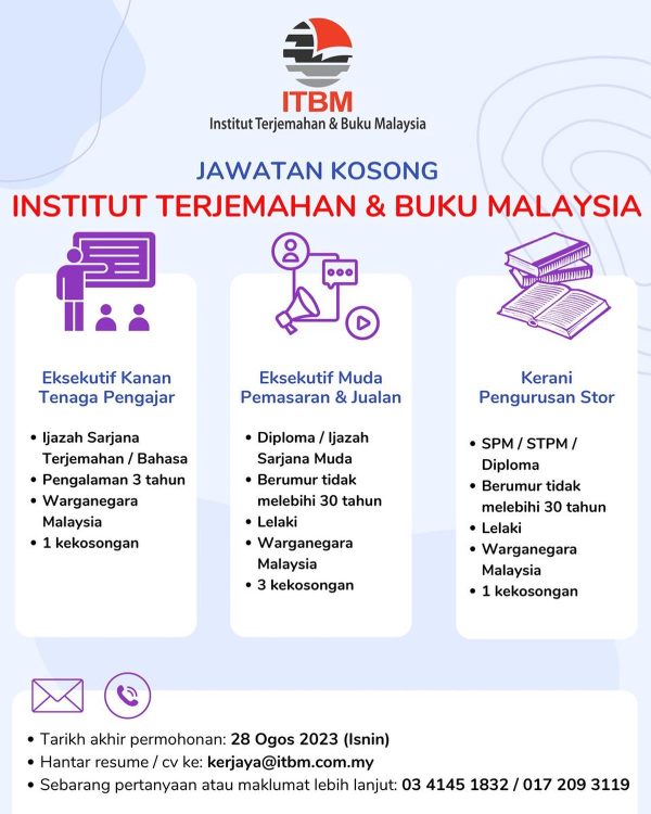 Iklan Jawatan Institut Terjemahan & Buku Malaysia (ITBM) Like serta Ikut Facebook Kami, follow Chanel WhatsApp Jawatan Kosong & Telegram Portal SPA9 untuk capaian pantas kekosongan jawatan daripada kami sekarang.