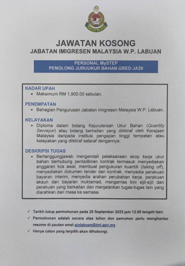 Iklan Jawatan Jabatan Imigresen Malaysia Like serta Ikut Facebook Kami, follow Chanel WhatsApp Jawatan Kosong & Telegram Portal SPA9 untuk capaian pantas kekosongan jawatan daripada kami sekarang.