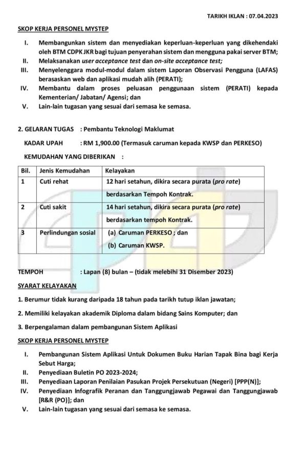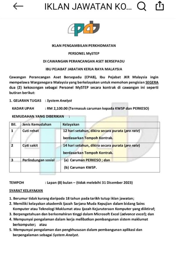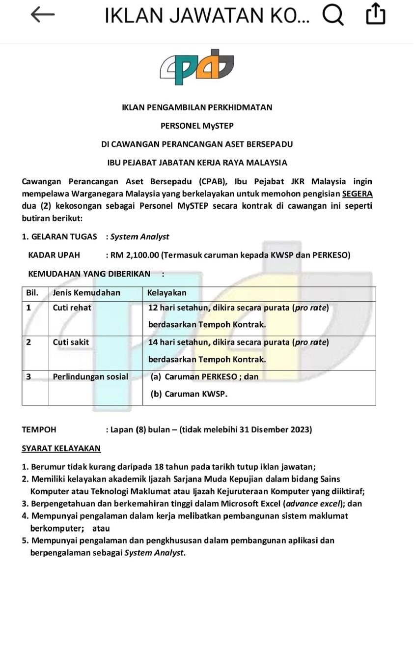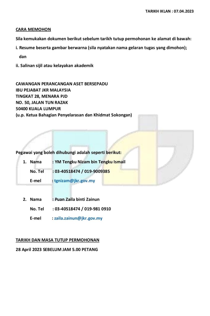 Iklan Jawatan Jabatan Kerja Raya (JKR) Like serta Ikut Facebook Kami, follow Chanel WhatsApp Jawatan Kosong & Telegram Portal SPA9 untuk capaian pantas kekosongan jawatan daripada kami sekarang.