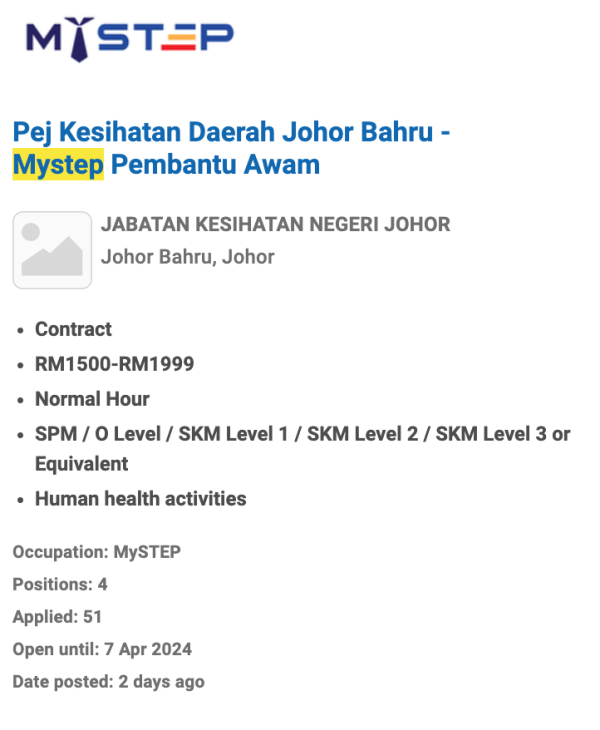 Permohonan jawatan ini boleh dibuat melalui Portal MyFutureJobs. Sila ke Portal MyFutureJobs dan Masukkan Kata Carian yang ingin dicari “JABATAN KESIHATAN NEGERI JOHOR” di bahagian carian untuk memohon jawatan yang diiklankan.