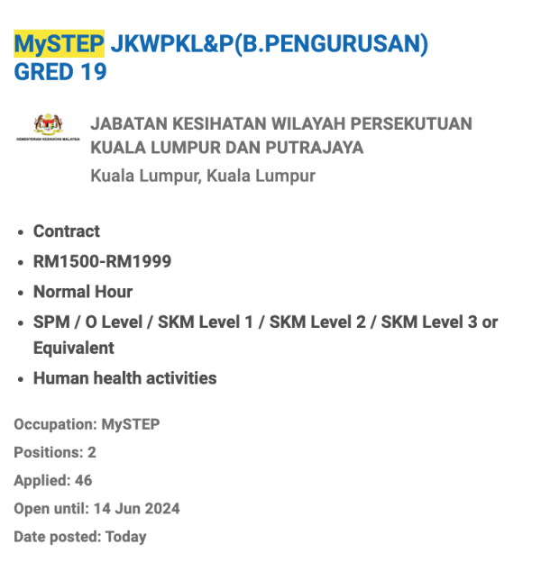 Iklan Jawatan Jabatan Kesihatan Wilayah Persekutuan Kuala Lumpur Dan Putrajaya