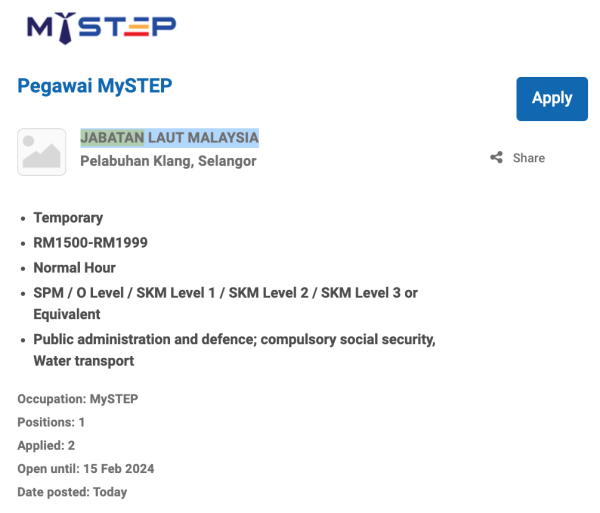 Iklan Jawatan Jabatan Laut Malaysia Like serta Ikut Facebook Kami, follow Chanel WhatsApp Jawatan Kosong & Telegram Portal SPA9 untuk capaian pantas kekosongan jawatan daripada kami sekarang.