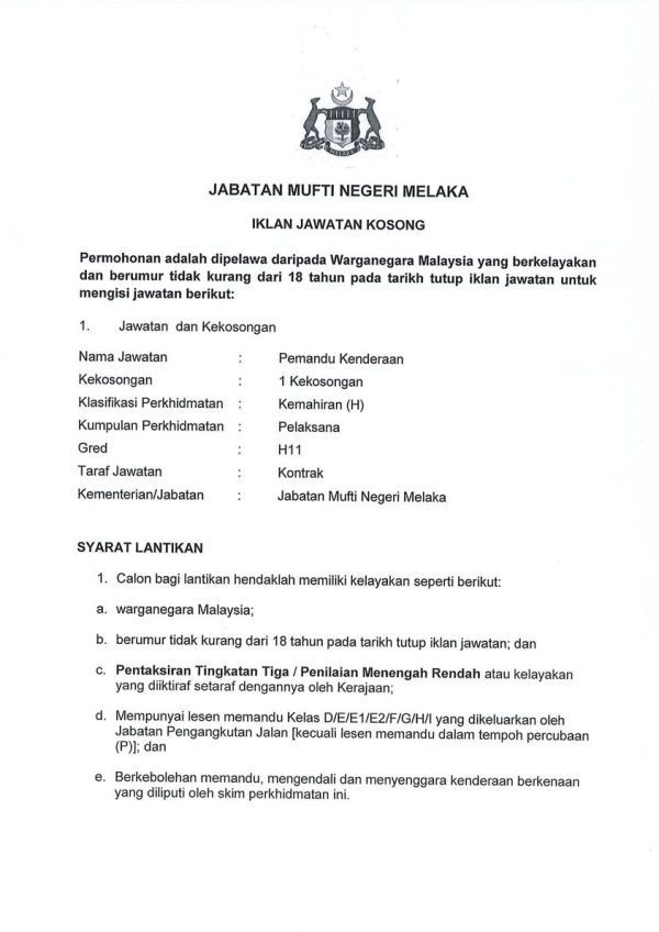 Iklan Jawatan Jabatan Mufti Negeri Melaka Like serta Ikut Facebook Kami, follow Chanel WhatsApp Jawatan Kosong & Telegram Portal SPA9 untuk capaian pantas kekosongan jawatan daripada kami sekarang.