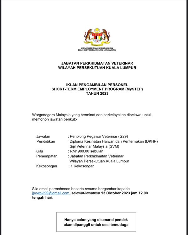 Iklan Jawatan Jabatan Perkhidmatan Veterinar