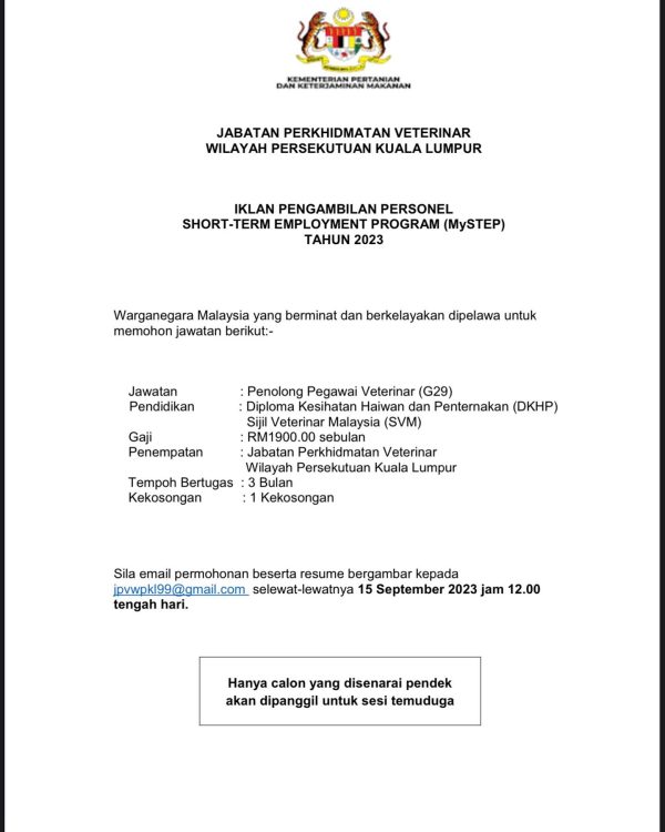 Iklan Jawatan Jabatan Perkhidmatan Veterinar Persekutuan Kuala Lumpur (DVS WPKL) Like serta Ikut Facebook Kami, follow Chanel WhatsApp Jawatan Kosong & Telegram Portal SPA9 untuk capaian pantas kekosongan jawatan daripada kami sekarang.