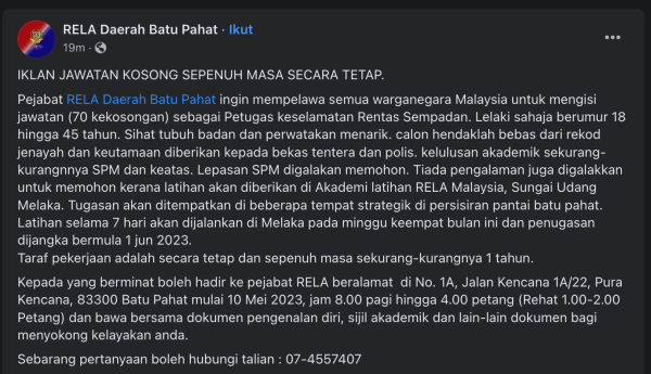 Iklan Jawatan Jabatan Sukarelawan Malaysia (RELA) Like serta Ikut Facebook Kami, follow Chanel WhatsApp Jawatan Kosong & Telegram Portal SPA9 untuk capaian pantas kekosongan jawatan daripada kami sekarang.