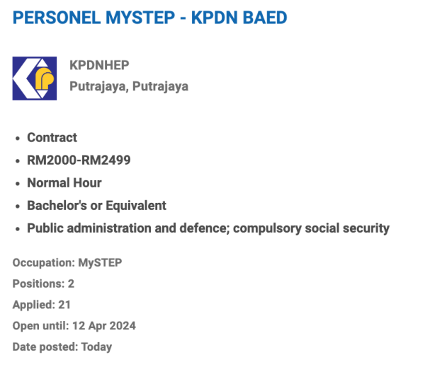 Permohonan jawatan ini boleh dibuat melalui Portal MyFutureJobs. Sila ke Portal MyFutureJobs dan Masukkan Kata Carian yang ingin dicari “KPDNHEP” di bahagian carian untuk memohon jawatan yang diiklankan.