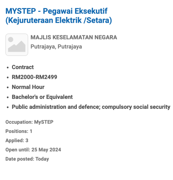 Permohonan jawatan ini boleh dibuat melalui Portal MyFutureJobs. Sila ke Portal MyFutureJobs dan Masukkan Kata Carian yang ingin dicari “MAJLIS KESELAMATAN NEGARA” di bahagian carian untuk memohon jawatan yang diiklankan.