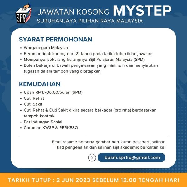 Iklan Jawatan Suruhanjaya Pilihan Raya Malaysia (SPR) Like serta Ikut Facebook Kami, follow Chanel WhatsApp Jawatan Kosong & Telegram Portal SPA9 untuk capaian pantas kekosongan jawatan daripada kami sekarang.
