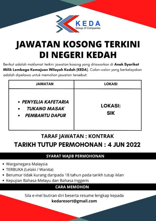 Iklan Jawatan Lembaga Kemajuan Wilayah Kedah (KEDA) Like serta Ikut Facebook Kami, follow Chanel WhatsApp Jawatan Kosong & Telegram Portal SPA9 untuk capaian pantas kekosongan jawatan daripada kami sekarang.