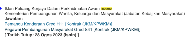 Iklan Jawatan Kementerian Pembangunan Wanita, Keluarga Dan Masyarakat Like serta Ikut Facebook Kami, follow Chanel WhatsApp Jawatan Kosong & Telegram Portal SPA9 untuk capaian pantas kekosongan jawatan daripada kami sekarang. Klik Iklan Jawatan