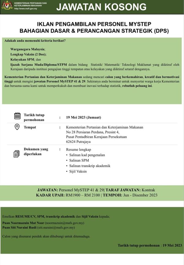 Iklan Jawatan Kementerian Pertanian Dan Industri Makanan (MAFI) Like serta Ikut Facebook Kami, follow Chanel WhatsApp Jawatan Kosong & Telegram Portal SPA9 untuk capaian pantas kekosongan jawatan daripada kami sekarang.