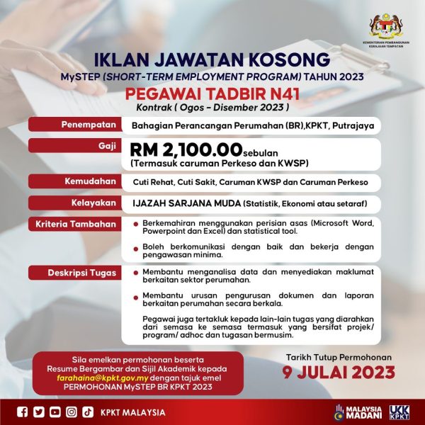 Iklan Jawatan Kementerian Perumahan & Kerajaan Tempatan (KPKT) Like serta Ikut Facebook Kami, follow Chanel WhatsApp Jawatan Kosong & Telegram Portal SPA9 untuk capaian pantas kekosongan jawatan daripada kami sekarang.