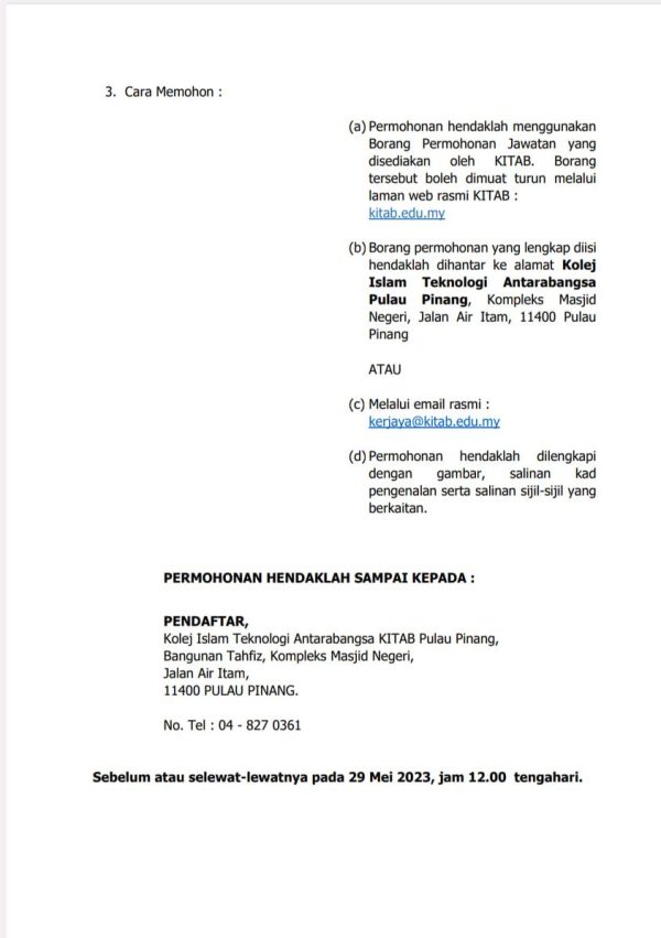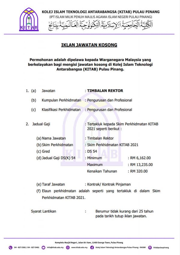 Iklan Jawatan Kolej Islam Teknologi Antarabangsa (KITAB) Like serta Ikut Facebook Kami, follow Chanel WhatsApp Jawatan Kosong & Telegram Portal SPA9 untuk capaian pantas kekosongan jawatan daripada kami sekarang.